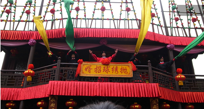 來到宋城,首先不得不說的是王員外千金拋繡球招親的表演:二八年華的待嫁少女拋繡球選夫婿,和演員的互動,讓游客們也切身體會了一把古代的婚嫁習(xí)俗,不得不贊。